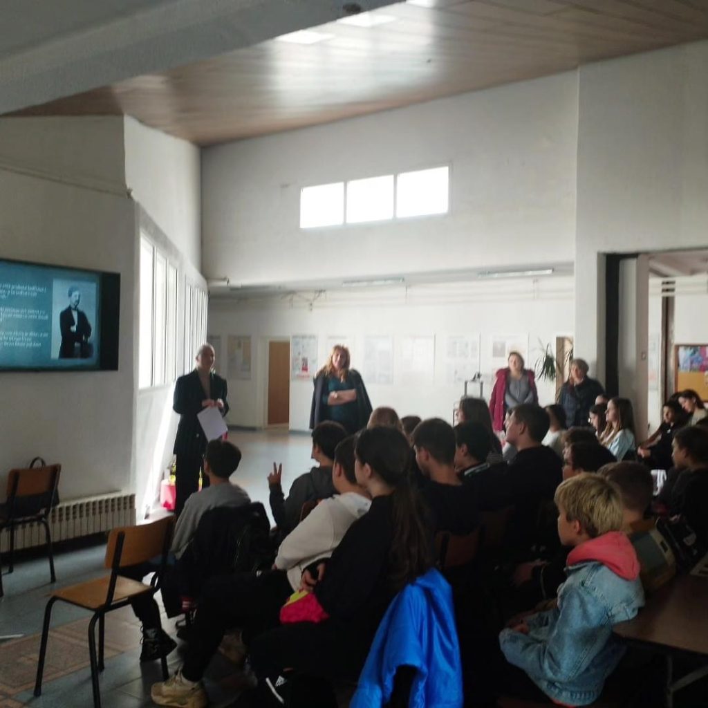 Bibliotekarka Nermina Čobić i nastavnice Crnogorskog-srpskog, bosanskog, hrvatskog jezika i književnosti pripremile su i predstavile, učenicima od VI do IX razreda, prezentaciju o životu i djelu pomenutog pisca.