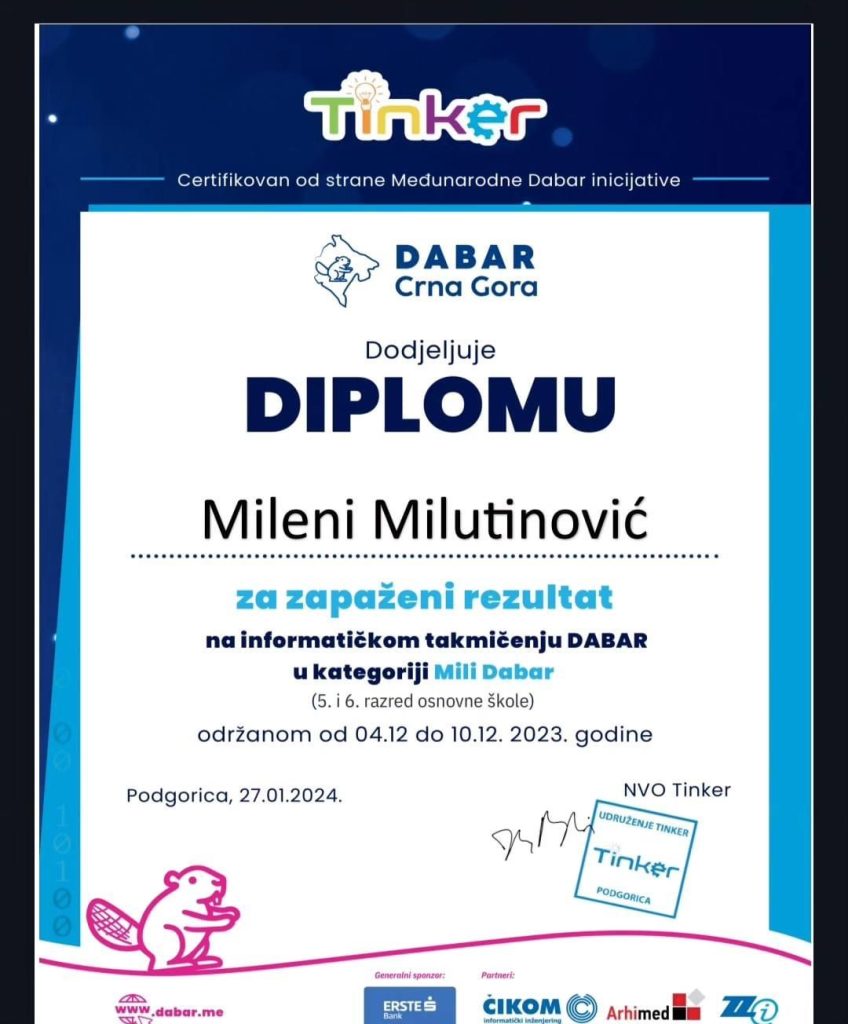 Učenica V razreda, Milena Milutinović, ostvarila je značajan rezultat. Milena je šesta na listi takmičara kategorije Mili Dabar, koja je ukupno brojala 1152 učenika.